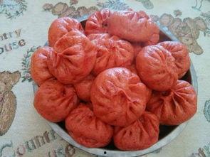 1. 鲜嫩多汁的红色包子,让人垂涎欲滴。